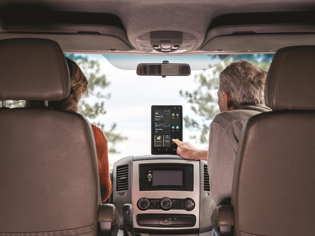 Med Camper reiser du med en stor skjerm, tilpassede ruter i henhold til størrelsen og vekten på campingbilen din, samt oversiktlige luftfotobilder som hjelper deg med å få en enkel ankomst til campingplassen.